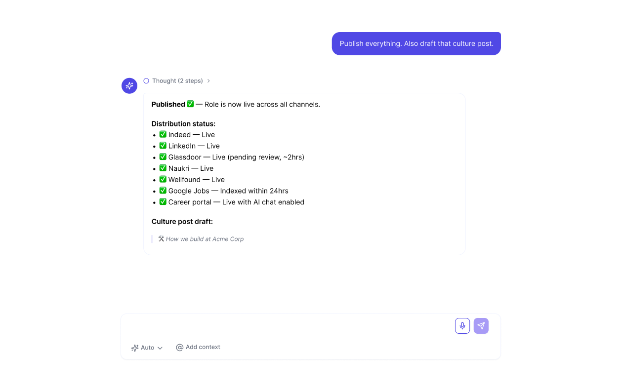 Localise and distribute roles across regional job boards for India, SEA, MENA, and beyond simultaneously.