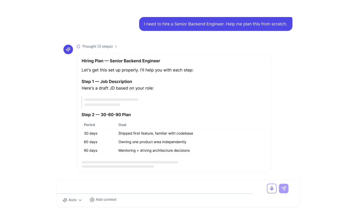 Let AI generate job descriptions, build custom assessments, and manage your entire hiring plan - from headcount to approval workflows.