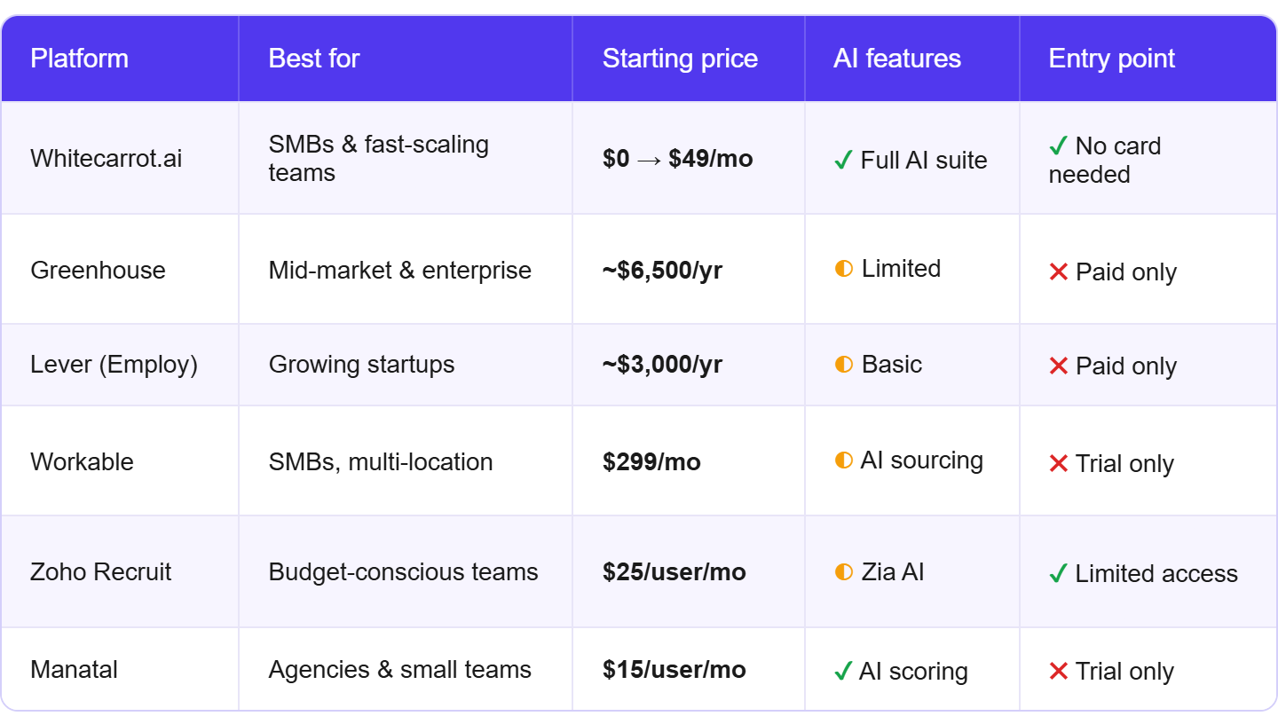 - Flat monthly plans - increasingly popular with modern platforms like Whitecarrot.ai and Workable. Predictable and scalable.
